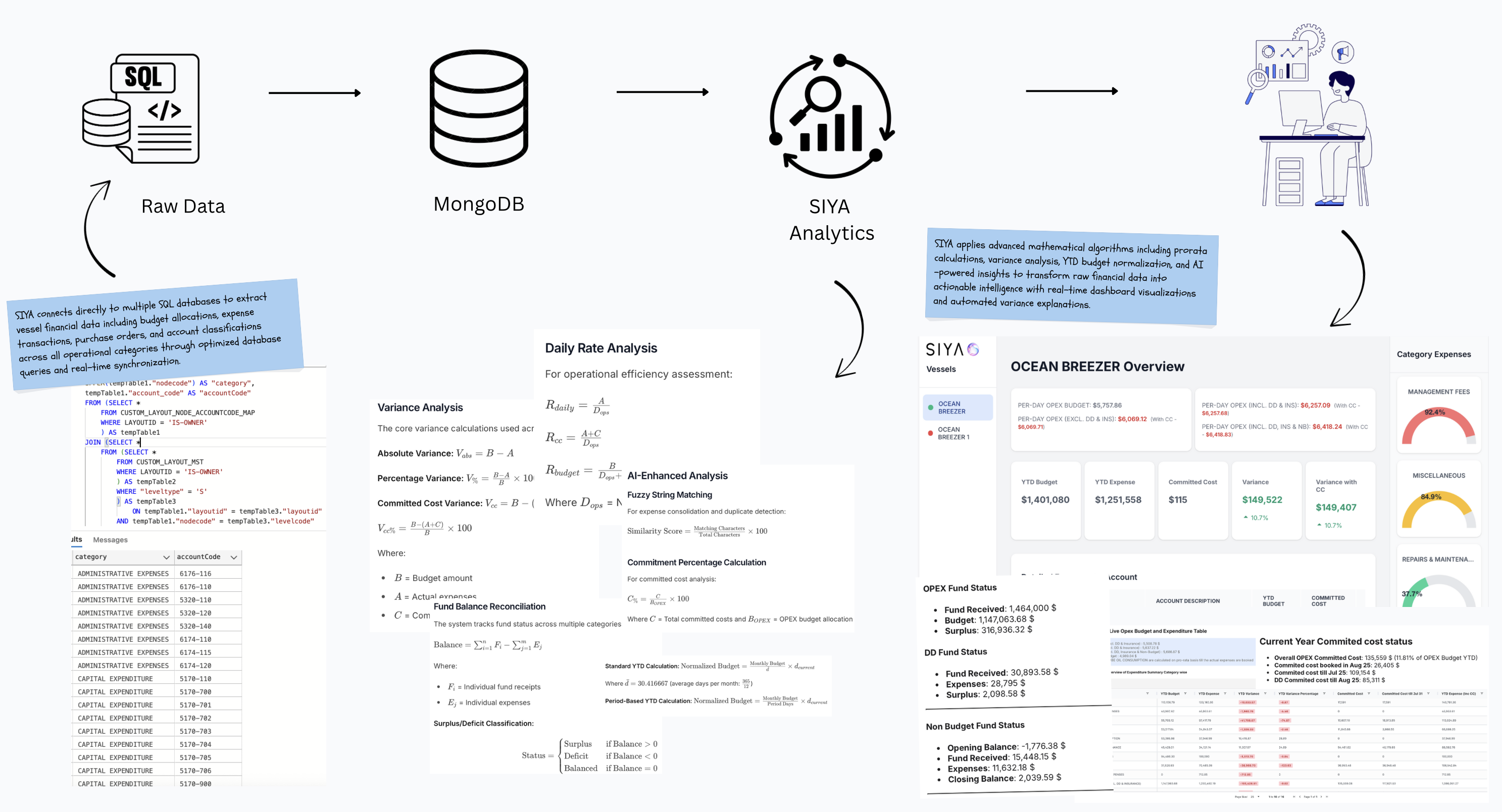 The SIYA financial analytics platform follows a comprehensive ETL architecture that processes data from multiple ERP sources through intelligent transformation and analysis layers:Architecture Components