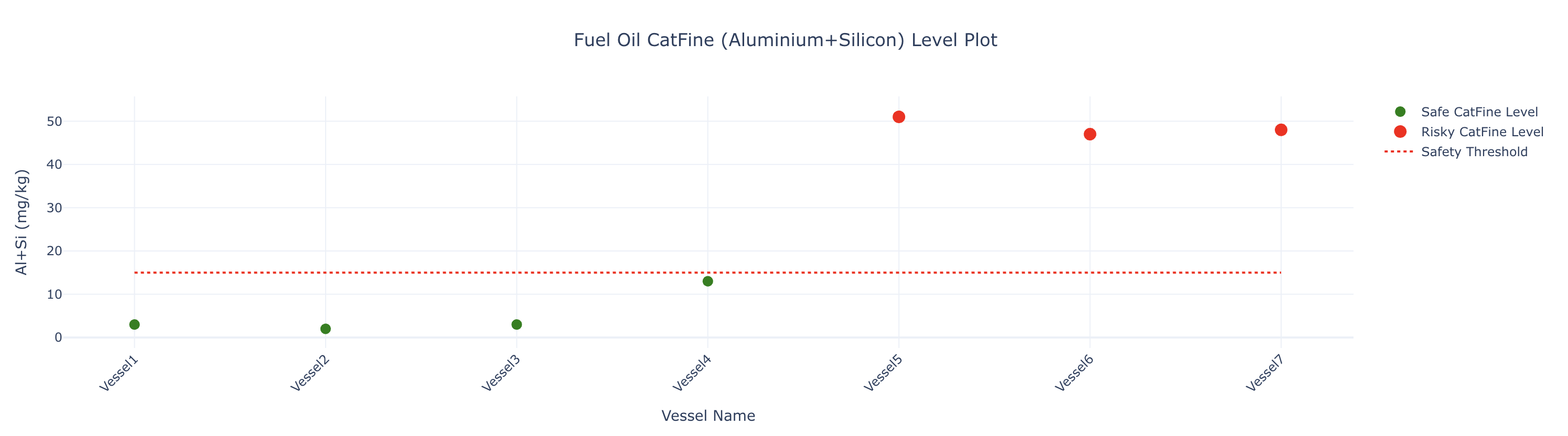 Implementation Strategy: Our advanced CatFine analysis system extracts concentration data from the latest bunkering operations and applies multi-tier risk assessment protocols. Primary Safety Threshold: A critical threshold of 15 mg/kg is implemented as the primary safety benchmark: Enhanced Multi-Tier Risk Classification: Our system implements three sophisticated risk bands for comprehensive vessel safety management: Risk Level Descriptions:- Safe Level (≤ 15 mg/kg): Vessel operates within optimal safety parameters