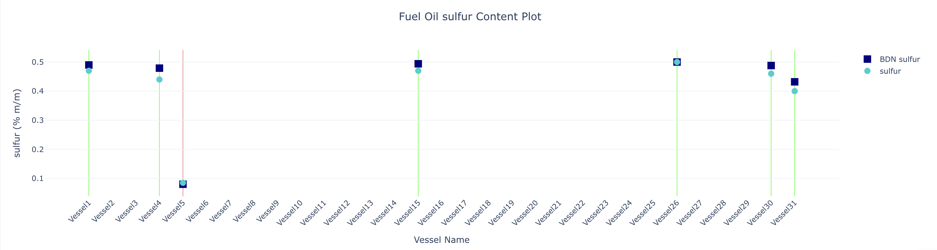 Compliance Algorithm: Our intelligent compliance system performs real-time comparison between laboratory-tested sulfur values and Bunker Delivery Note (BDN) specifications for each vessel in the fleet. Fleet-Level Compliance Assessment: The system generates comprehensive fleet-wide compliance reports:- Individual Vessel Analysis: Detailed compliance status for each vessel