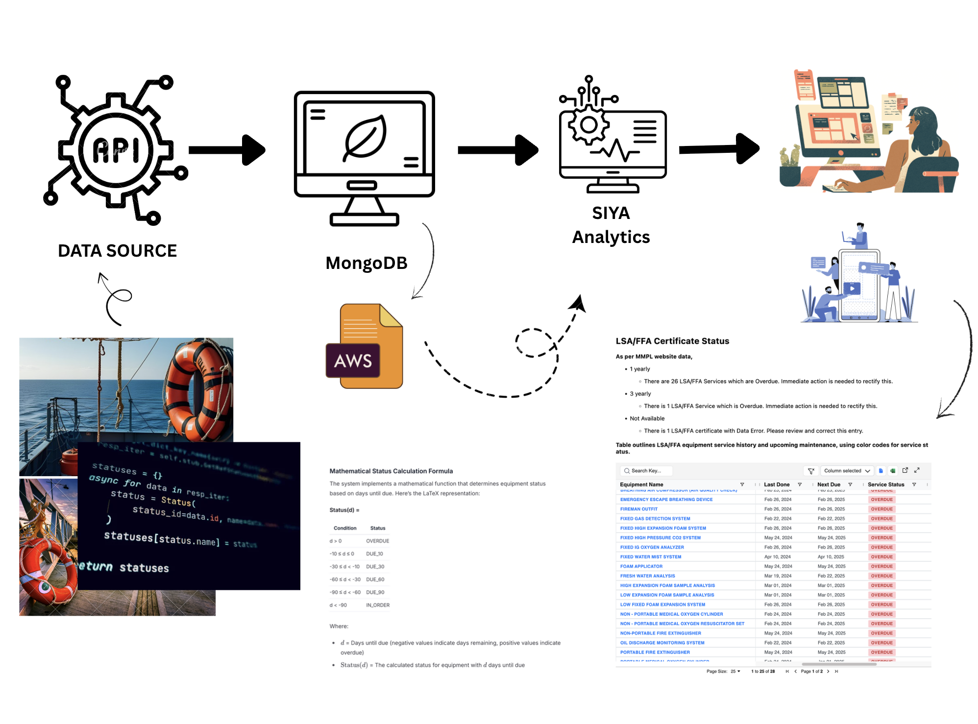 Primary Function: Real-time tracking of LSA/FFA certificate status with predictive alerts The Certificate Status Monitoring system provides intelligent service status calculation based on days until next service due, enabling proactive maintenance planning and regulatory compliance.Mathematical Status Calculation Formula