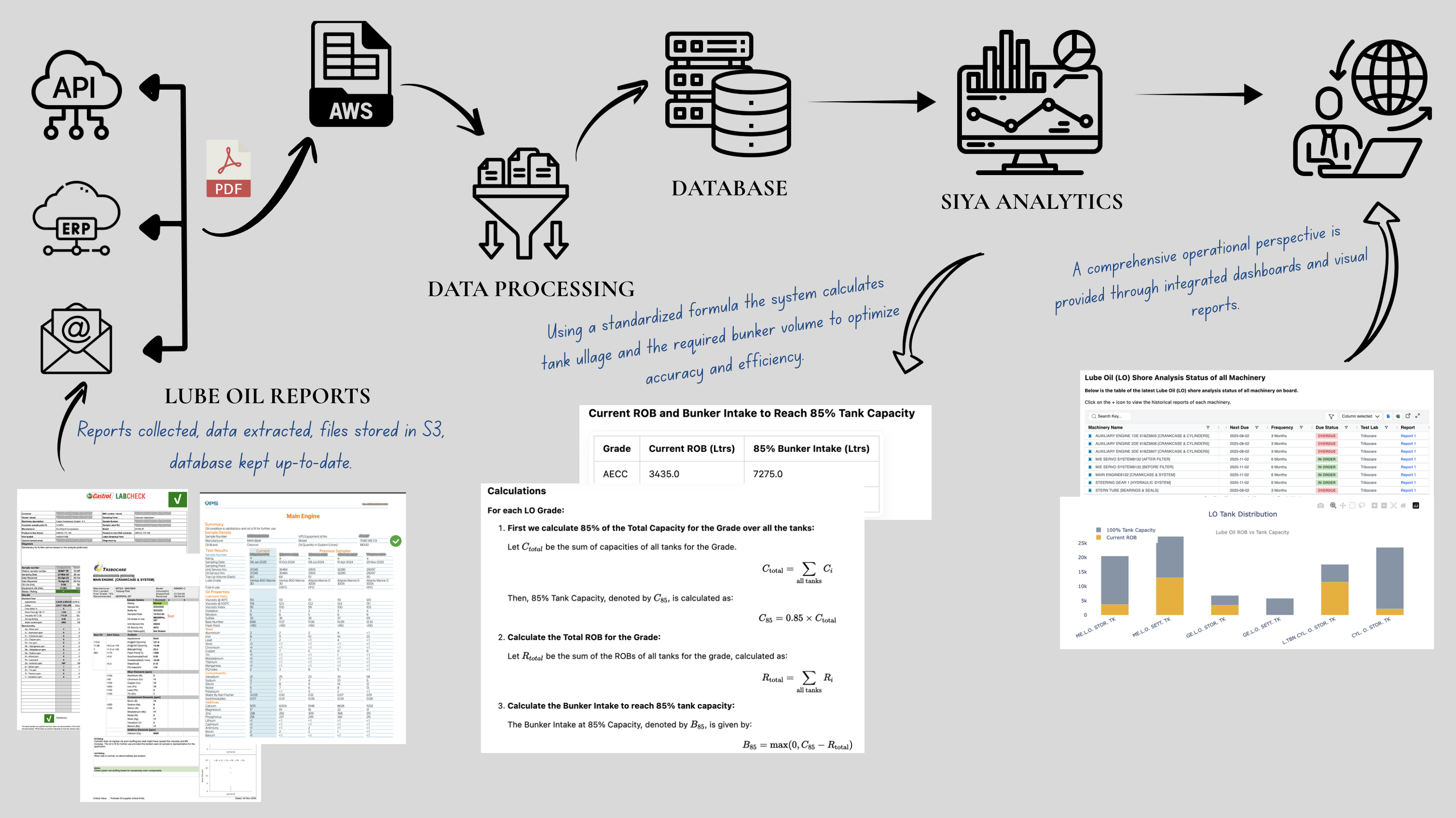This module provides a comprehensive, high-level overview of the entire lube oil analysis process, covering the Lube Oil Shore Analysis status of all machineries and the Lube Oil Tank Distribution and Capacity. These dashboards are specifically designed to keep track of lube oil quality and inventory, enabling proactive maintenance and optimizing bunker operations. The lube oil dashboard gives users the ability to follow up on when to submit the next samples for each piece of machinery, check the status of the last submitted samples, and access all corresponding reports. The flowchart below illustrates the data pipeline, showing how data is ingested from various sources, processed, stored, and ultimately presented in the dashboards.2. Data Sources